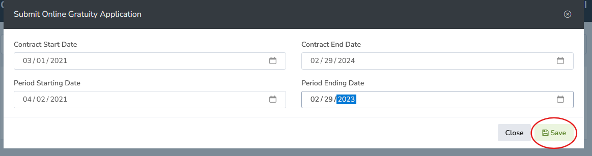3. Complete the respective fields then click the Save button to complete the online gratuity process. You should receive a notification providing further details regarding your gratuity application.