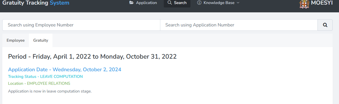 1. Select the Search tab. Enter your employee number and gratuity application number in the respective fields then click the Search button (i.e. button with the magnifying glass).